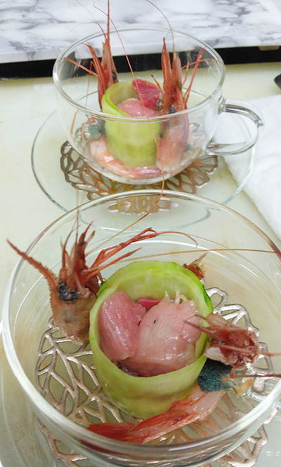 シェリーを加え6時間煮込み仕上げたステーキ&シーフード、鉄板焼の金沢男爵一押しの一品